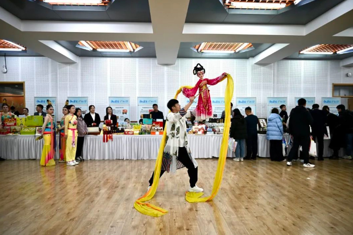 浮山剪纸传承人现场展示剪纸技艺,与高校师生进行互动,并赠送精美伴手礼。浮山木偶戏传承人现场表演杖头木偶长绸舞《梁祝》等剧目,吸引高校师生频频驻足。