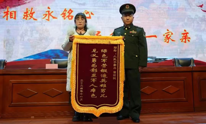 岳春英所说的锦旗,挂在家里的醒目位置,上面写有“绿色军营锻造英雄男儿 见义勇为彰显军人本色”。
