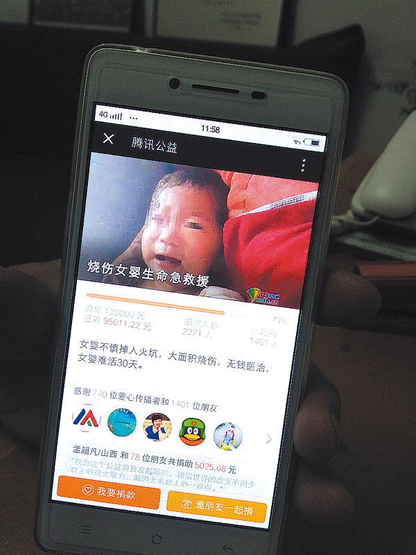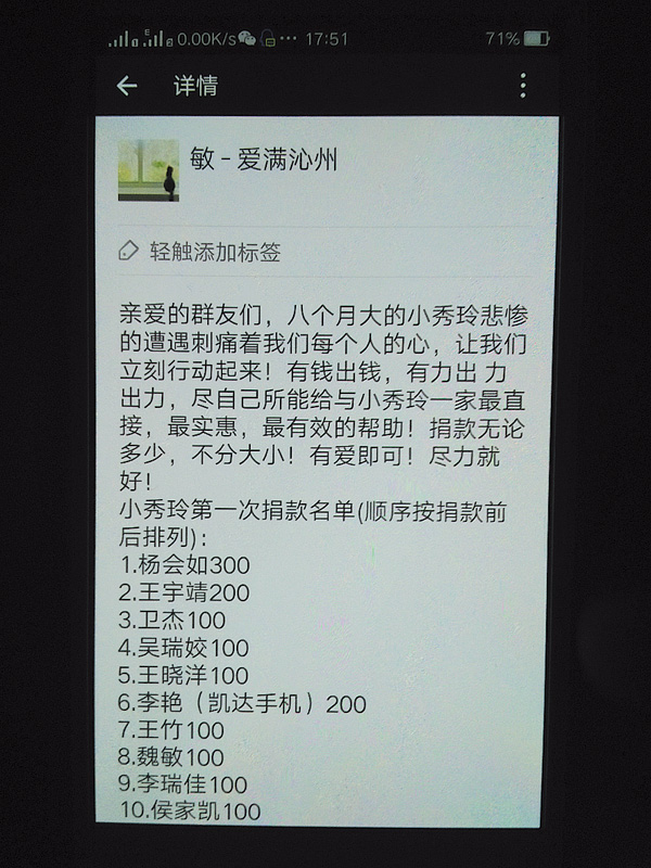 与此同时,在沁县为孩子治病筹款的活动也随之升级。"亲爱的群友们,八个月大的小秀玲不幸遭遇刺痛着我们每个人的心,让我们行动起来,有钱出钱,有力出力,尽自己所能给孩子一家最直接、最实惠、最有效的帮助!捐款无论多少,不分大小,有爱即可,尽力就好!"这是当晚一个叫"爱满沁州"的公益微信群为小秀玲发起的募捐信。一个晚上,这个只有213人群,募捐到339笔善款,总金额30466.09元。"沁县爱心义工家园""沁县爱心公益""长治职业交流""铜革是 商务俱乐部""海之声沁县情""一直美团队""飞扬舞蹈艺术中心"以及屯留、平遥等爱心公益微信群都在好友间展开募捐,三千、两千,一万、两万善款,向受捐账户汇集。25日,沁县爱心义工家园还在电影院前开展向社会募捐活动,当天筹款9463.1元。截止25日晚,沁县社会爱心捐款达到7万余元,并将全部善款通过银行打入受捐账户(小秀玲姑姑黄沁如银行卡)。太原一位叫贾向东的乡亲得到消息,多次联系相关媒体,并在一个叫"水侠·英雄会"的公益朋友圈里倡议捐款,一天多时间就筹集到15382元。
