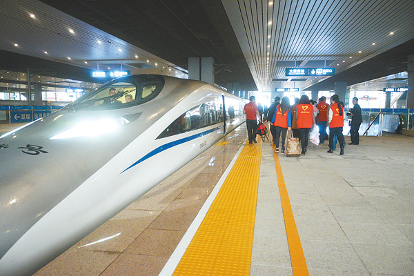 中午12时40分,车刚停靠在太原火车南站的落客区,车站党委副书记杨文忠带领工作人员就热情地前来接引,有的帮着拿行李、有的帮着撑伞,"婷婷爱心服务区"负责人蒲婷婷则帮着抱孩子,并用自己的钱为孩子叔叔姑姑等购买了车票……13时41分高铁启动,沁县的志愿者才依依不舍地下车返回。
