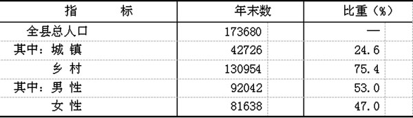年末全县有67216户,总人口为173680人,比上年减少3402人。出生人2110人,人口出生率为12.03‰;死亡人口1808人,死亡率为10.31‰;自然增长率为1.72‰;性别比(女=100)为112.71:100。